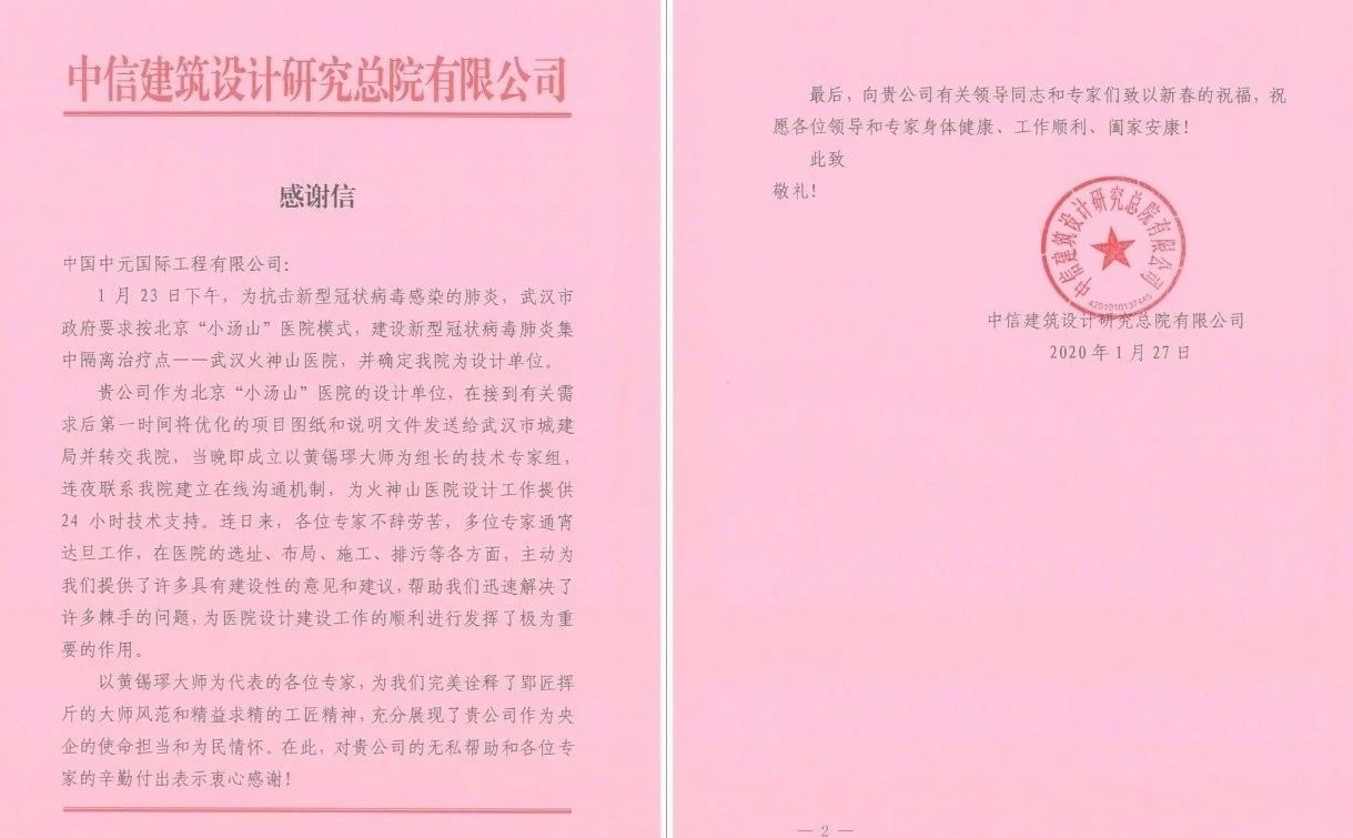 現在,武漢市火神山醫院順利建成、并投入使用,1 月 27 日,中國中元收到了來自中信建筑設計研究總院有限公司(以下簡稱“中信設計院”)發來的感謝信。中信設計院在信中表示,中國中元第一時間送達小湯山醫院圖紙,并提供 24 小時技術支持,幫助其解決了設計過程中的諸多棘手問題,推動了醫院設計建設工作的順利進行。中信設計院對中國中元的無私幫助和辛勤付出表示感謝,對黃錫璆博士郢匠揮斤的大師風范表達了敬意。